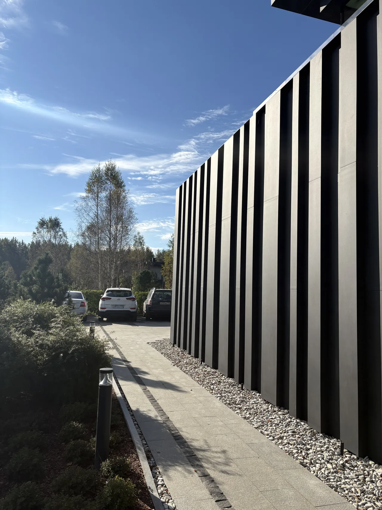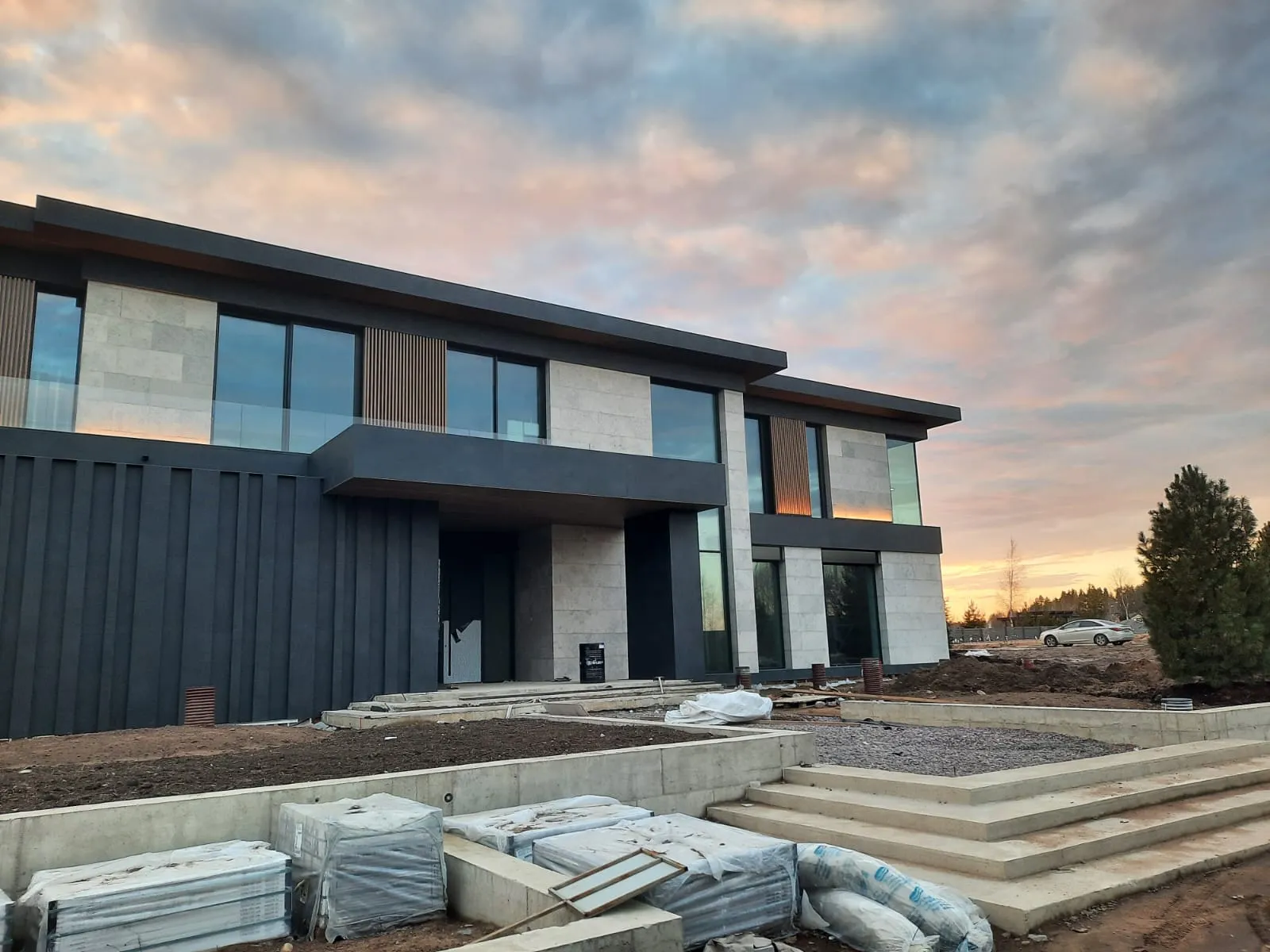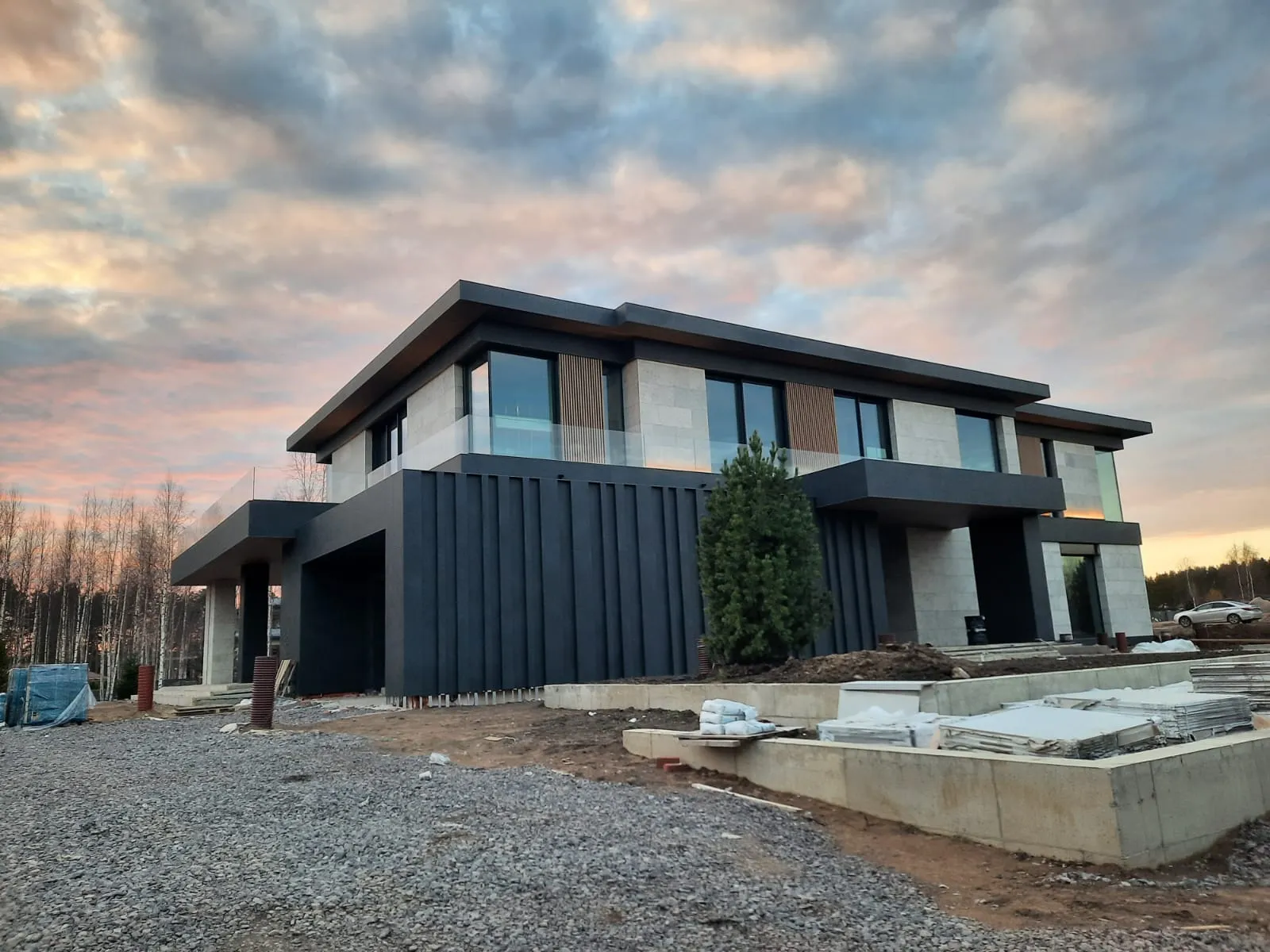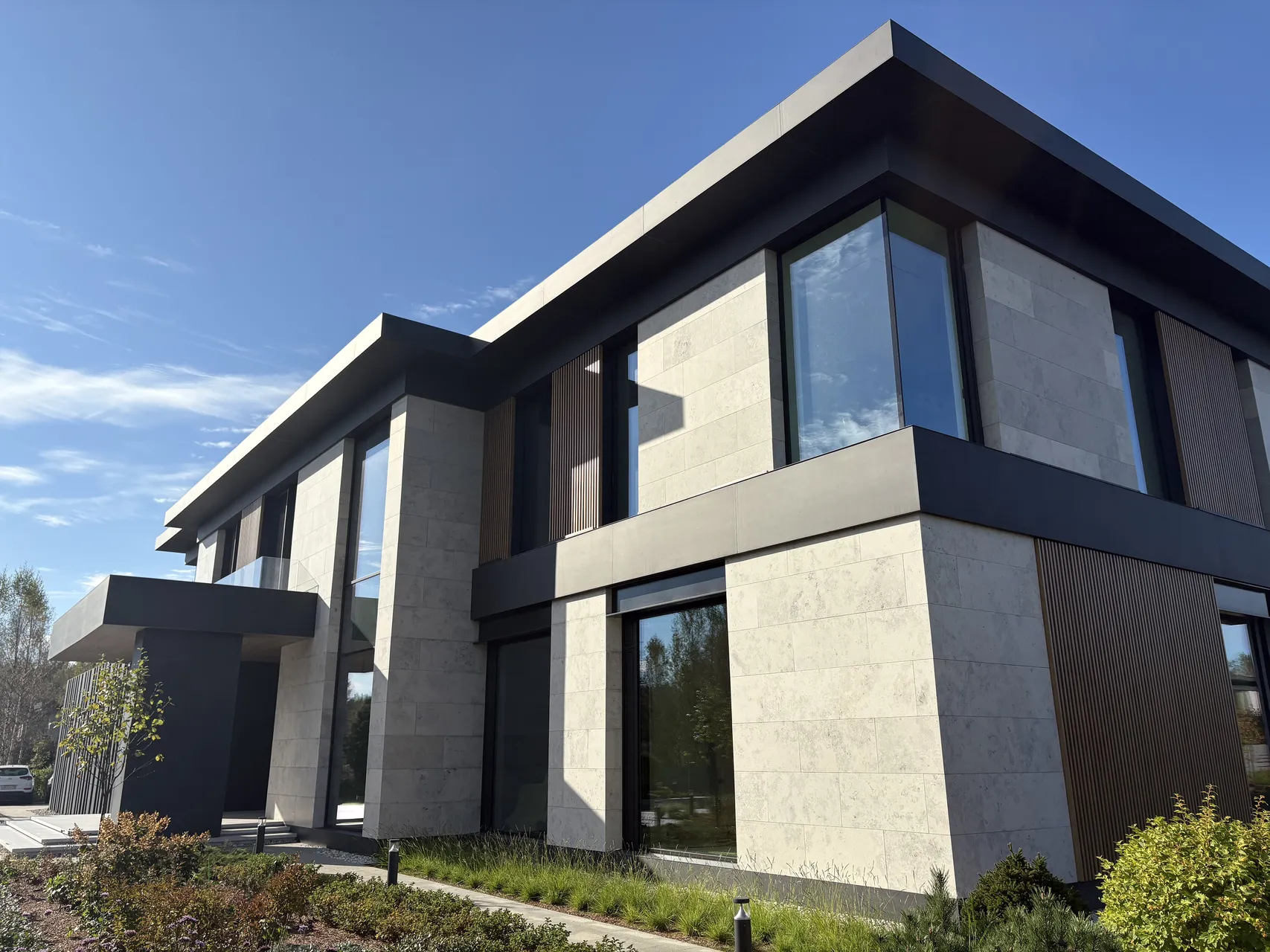 Клиент стремился к современному дизайну с акцентом на технологичность и натуральность. Фасад дома выполнен в стиле хай-тек с использованием широкоформатного керамогранита, алюминиевой рейки и натурального камня