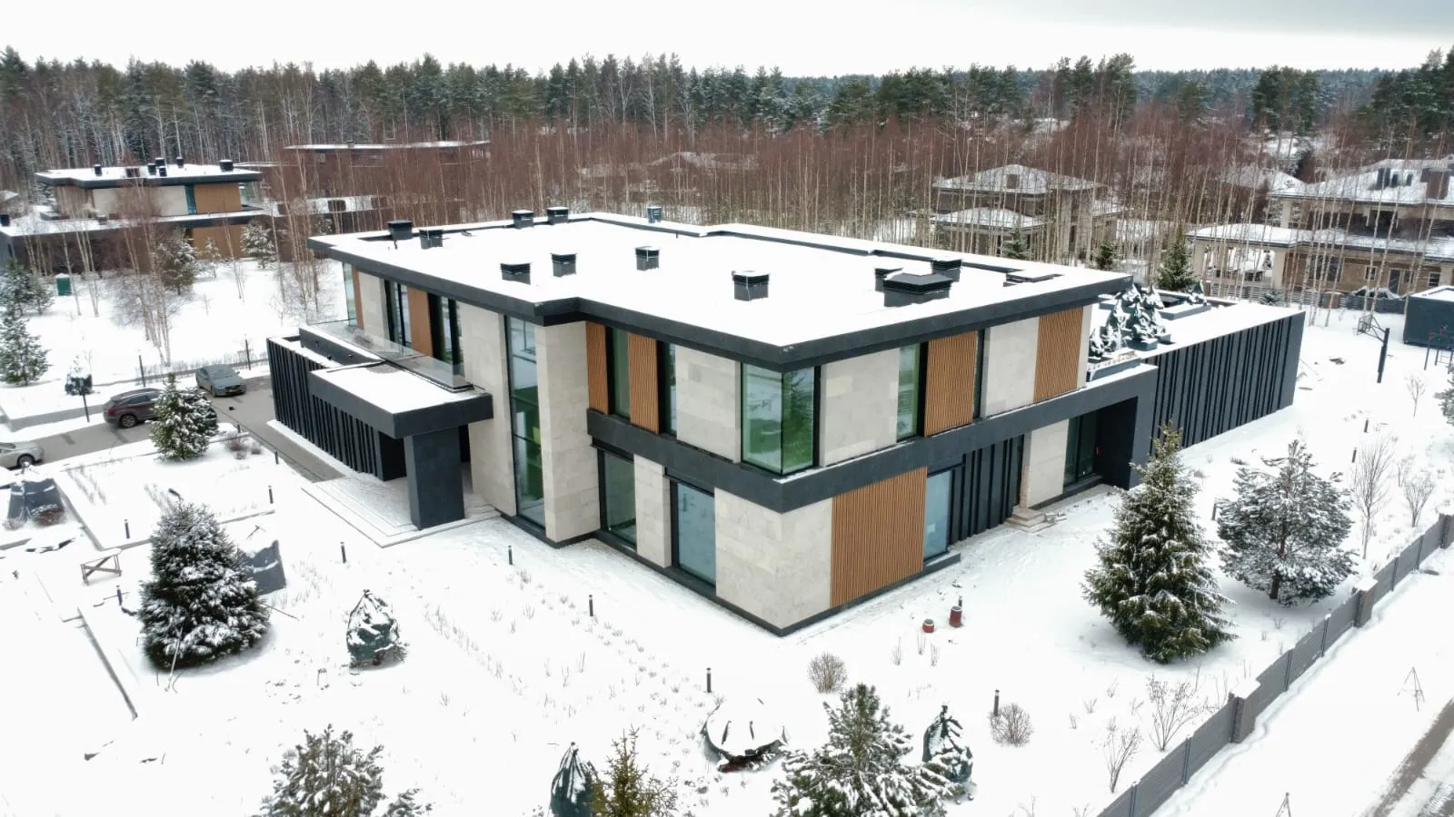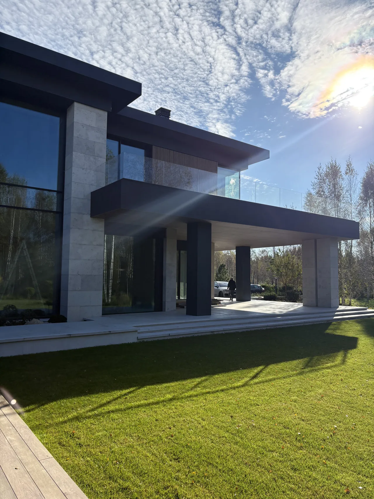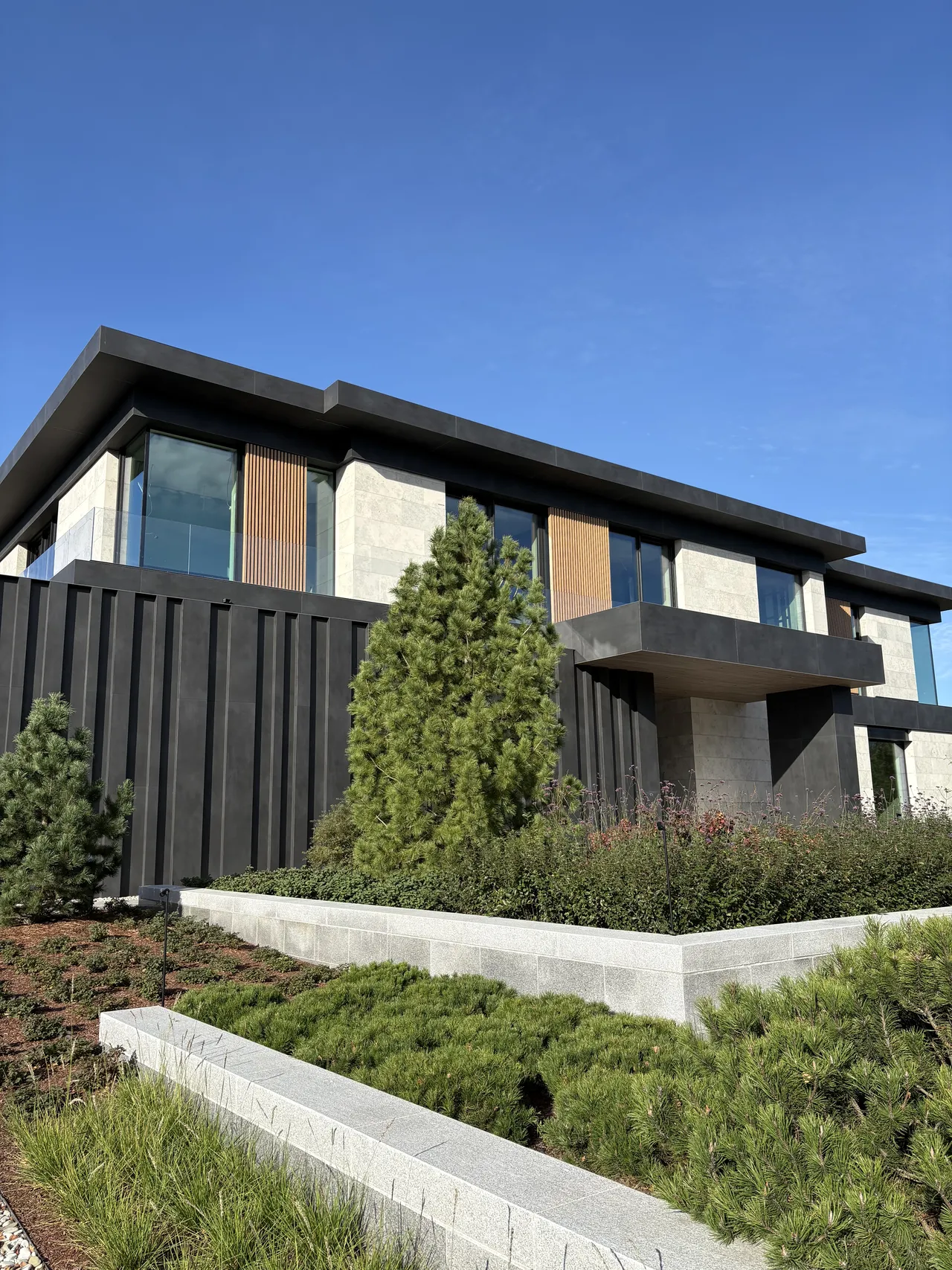 Клиент стремился к современному дизайну с акцентом на технологичность и натуральность. Фасад дома выполнен в стиле хай-тек с использованием широкоформатного керамогранита, алюминиевой рейки и натурального камня
