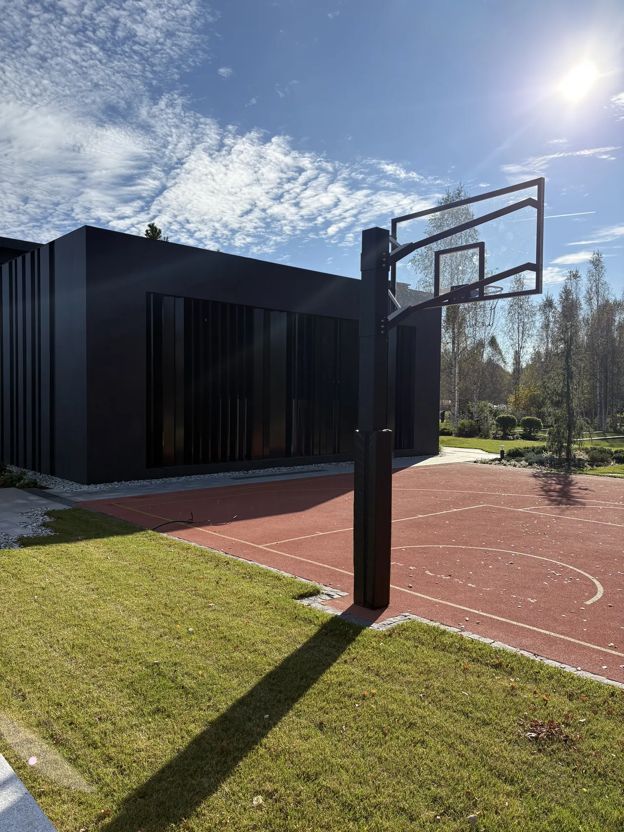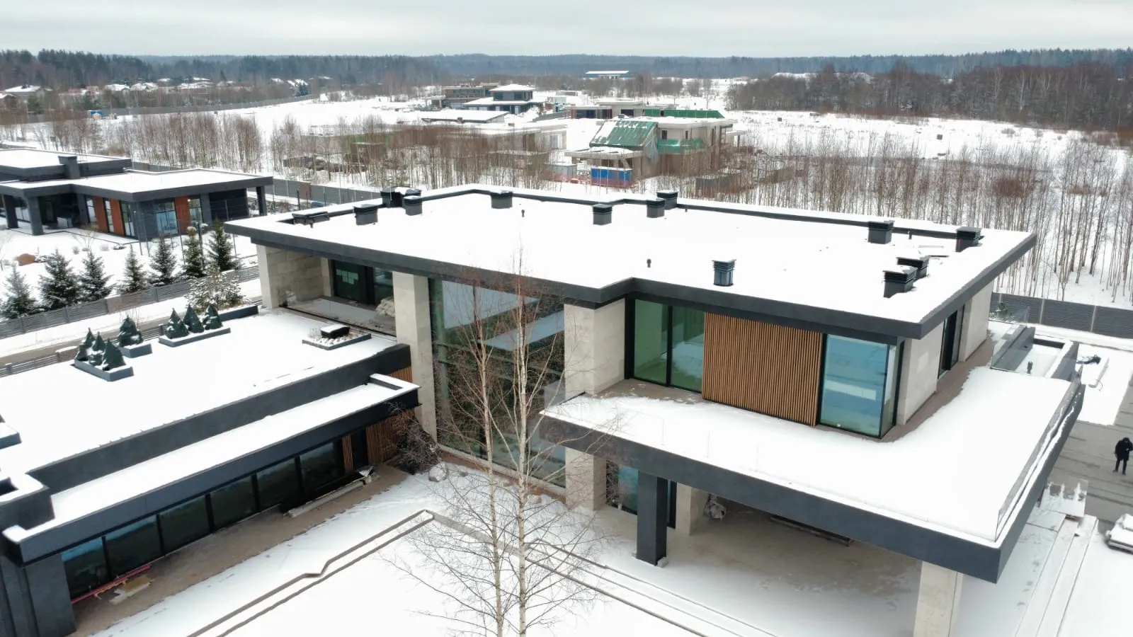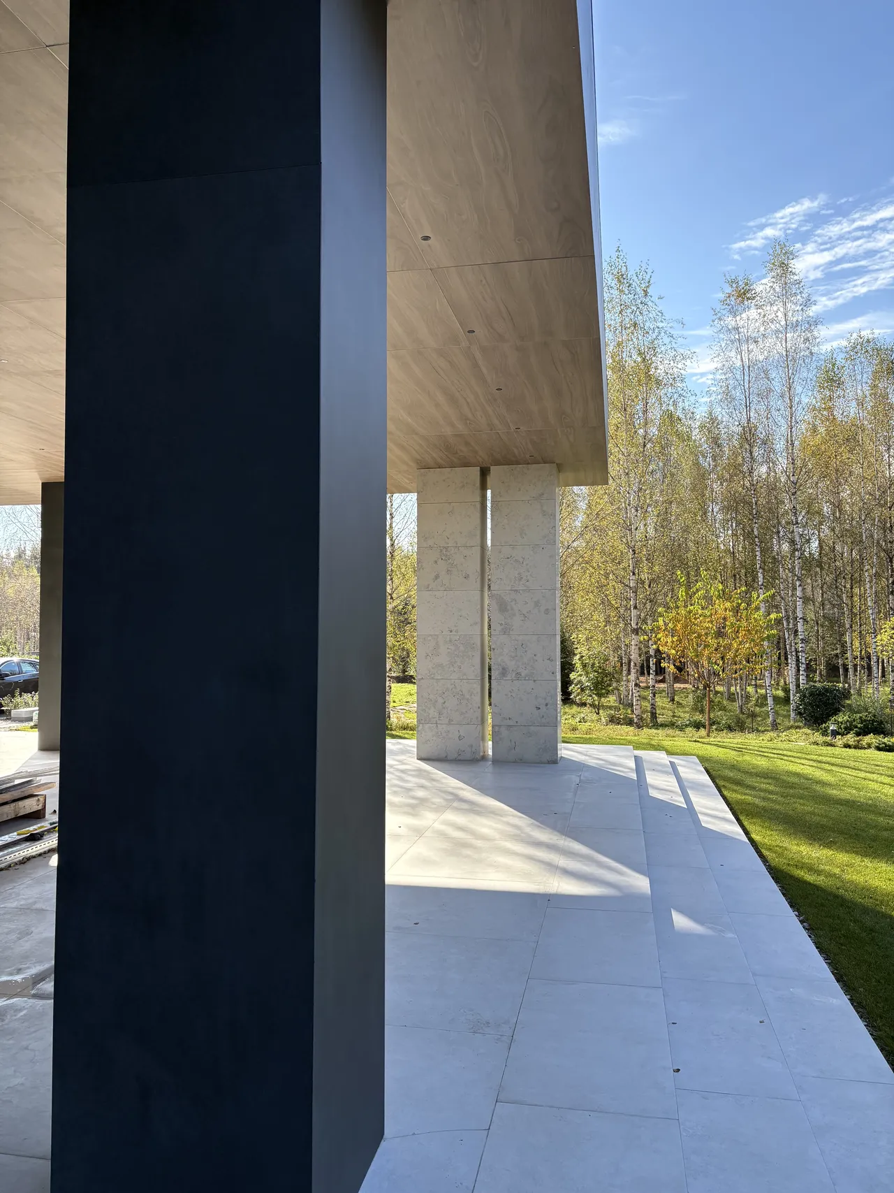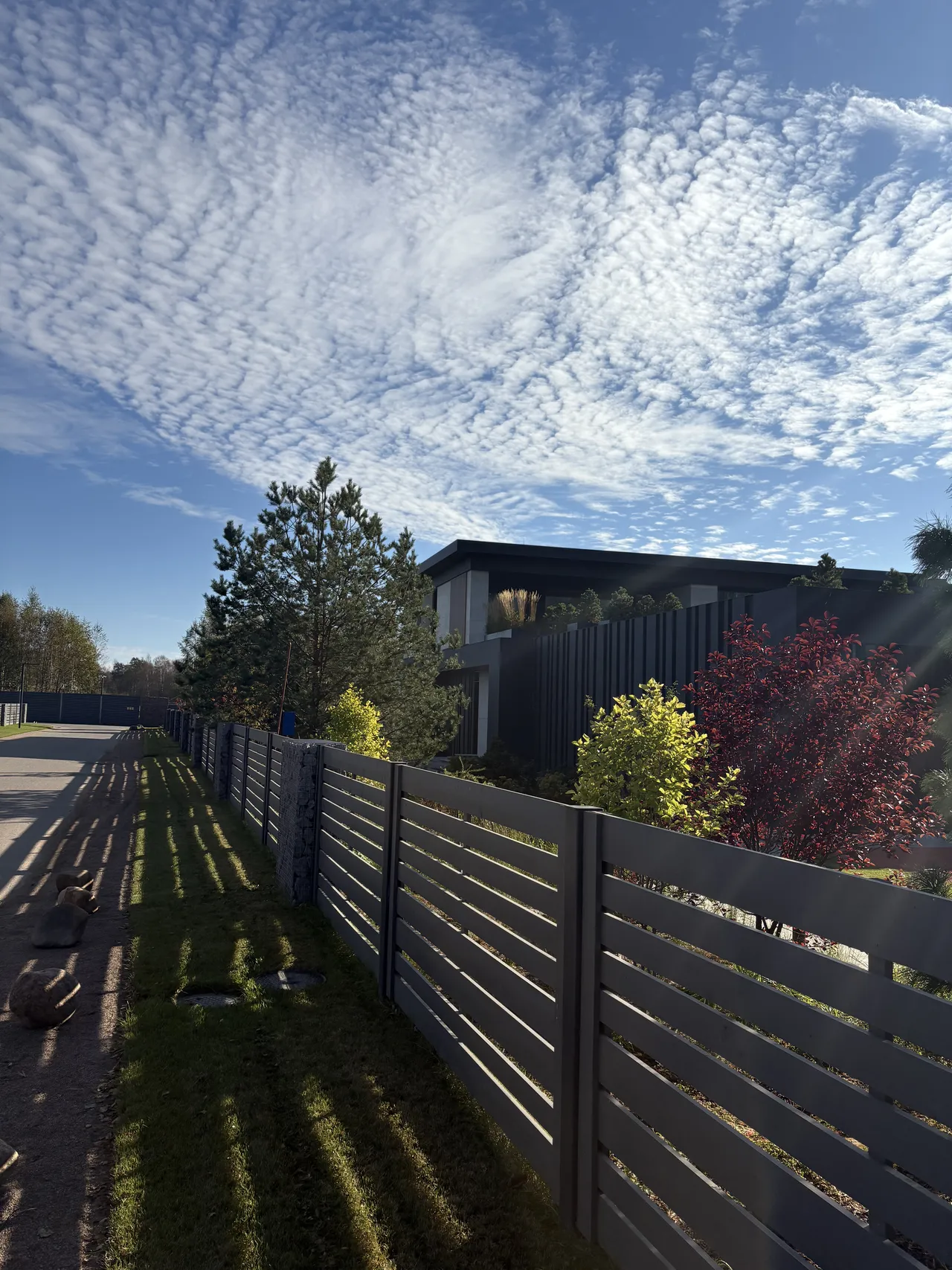 Клиент стремился к современному дизайну с акцентом на технологичность и натуральность. Фасад дома выполнен в стиле хай-тек с использованием широкоформатного керамогранита, алюминиевой рейки и натурального камня