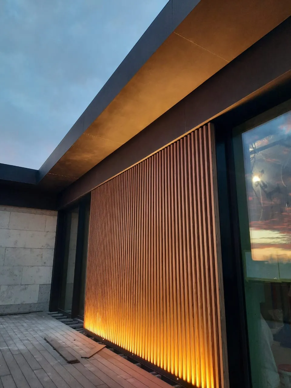 Широкоформатный керамогранит 3000×1000 м, алюминиевая рейка, натуральный камень 1200х600 мм, алюминевые композитные панели (декор элемент); у входной группы, над окнами и над бассейном NodFox (Г образный профиль и Т образный профиль), профессиональный крепёж Фиксар и BAU-FIX
